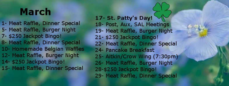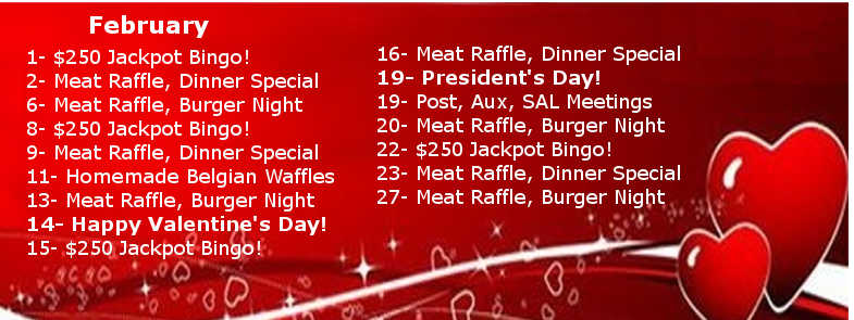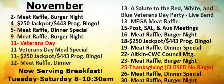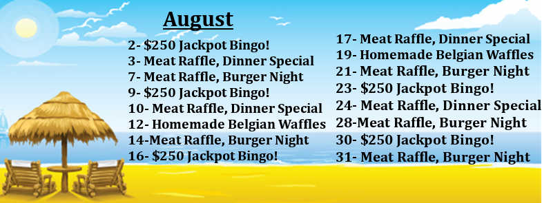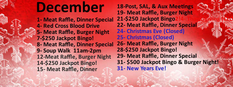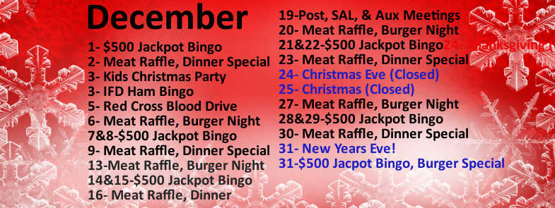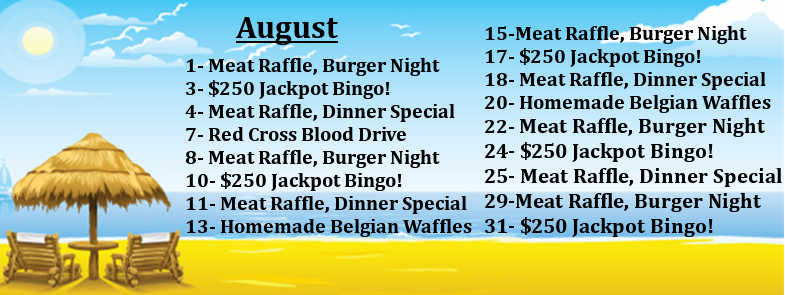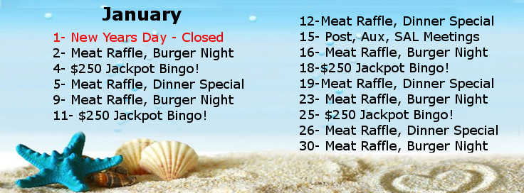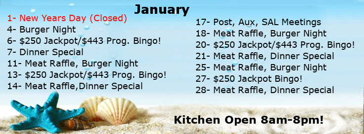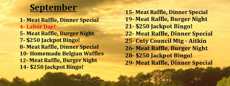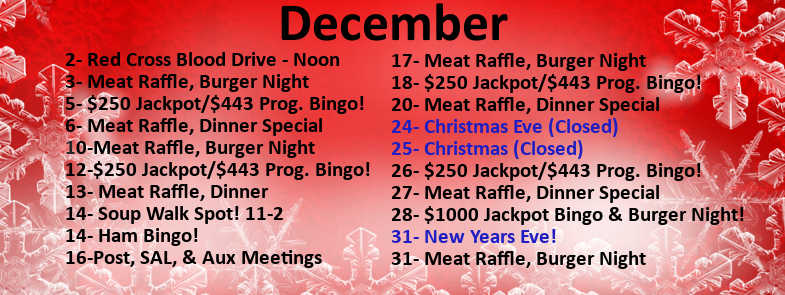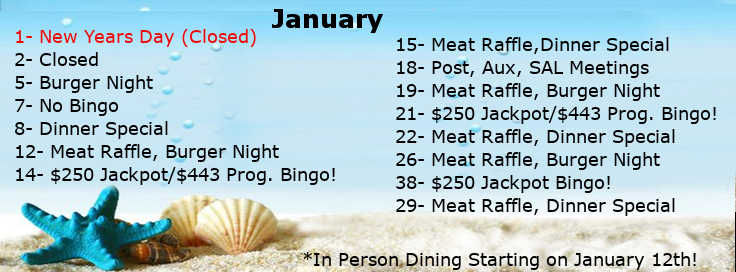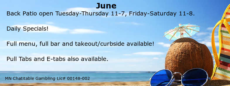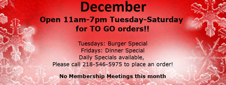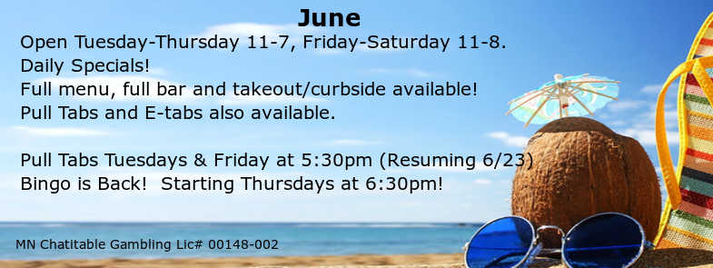 We will be open for in-person dining starting Tuesday, January 12th, 2021 at 11am. Please follow all applicable state guidance. Pull Tabs, E-tabs, Meat Raffle and Bingos will resume as normal. MN Charitable Gambling Lic # 00148-002
