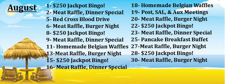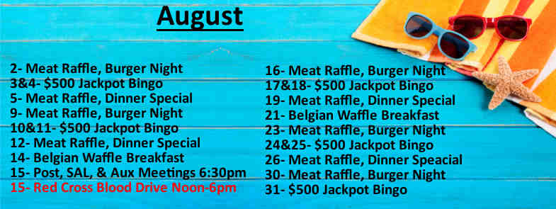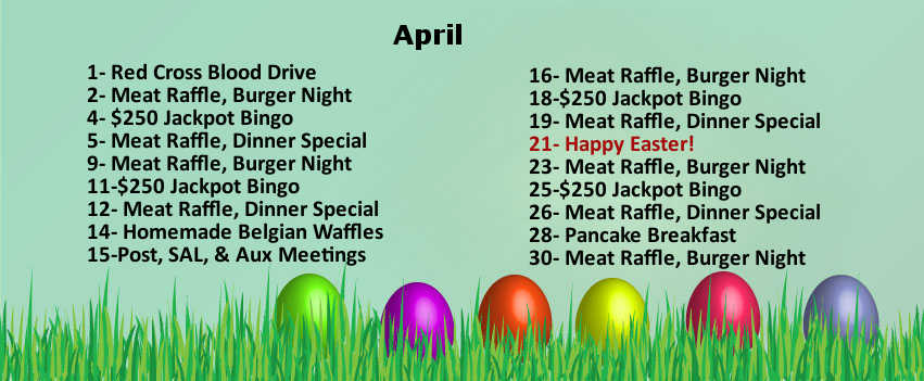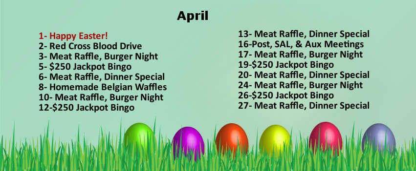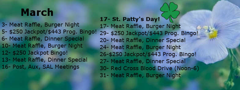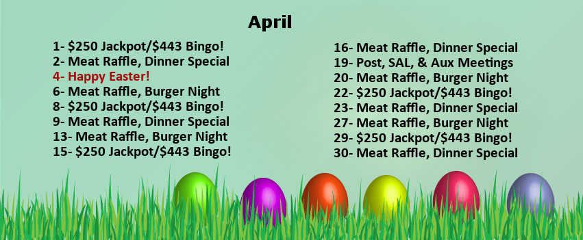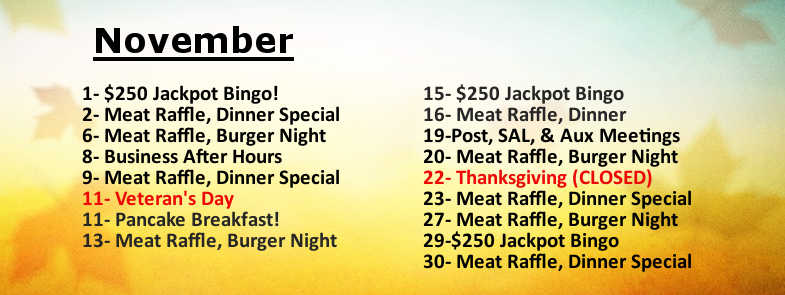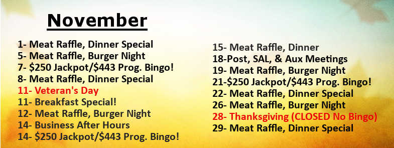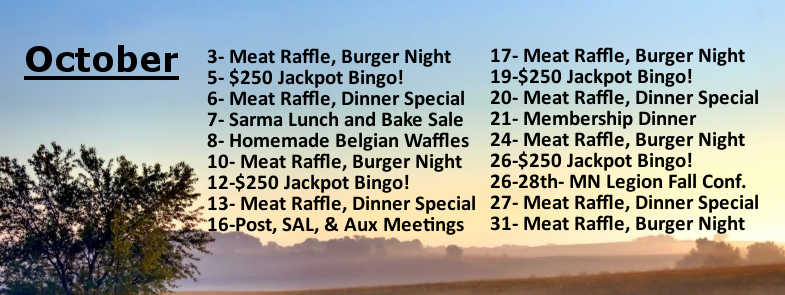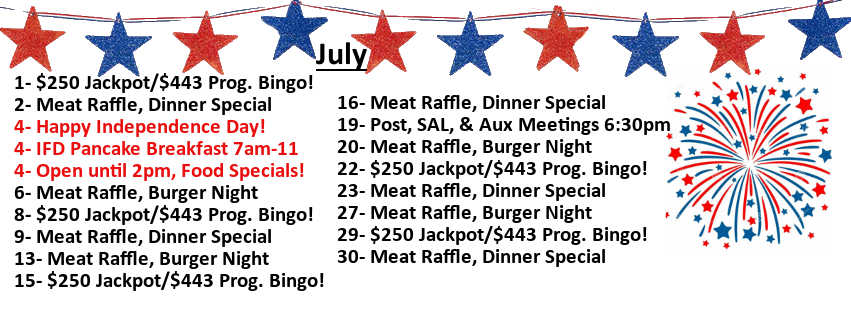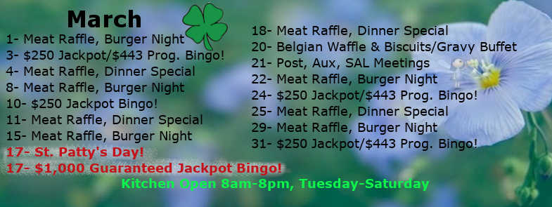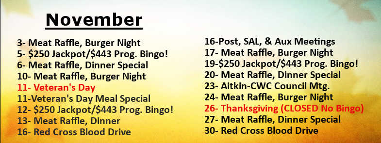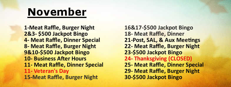 We will be open for in-person dining starting Tuesday, January 12th, 2021 at 11am. Please follow all applicable state guidance. Pull Tabs, E-tabs, Meat Raffle and Bingos will resume as normal. MN Charitable Gambling Lic # 00148-002