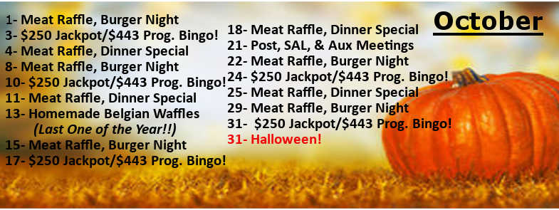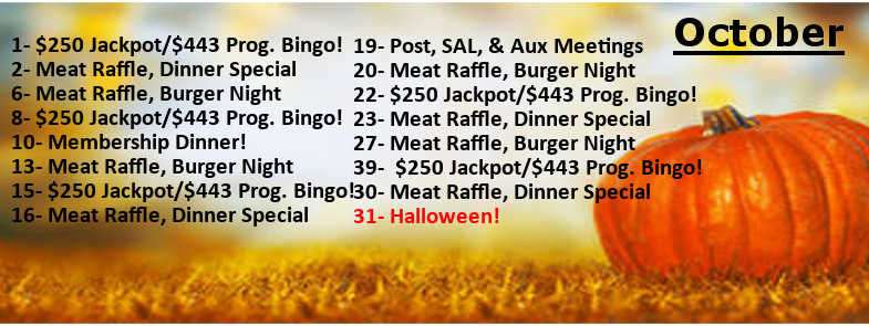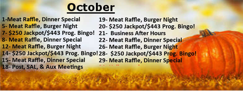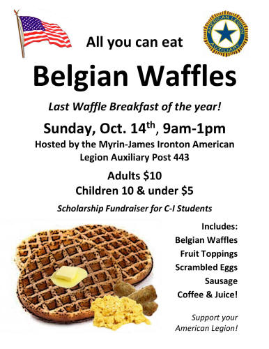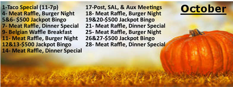 Bake Sale items may be dropped off at the Ironton Legion on Friday, October 14th between 2:00-8:00pm.