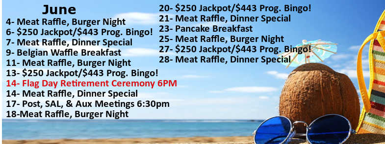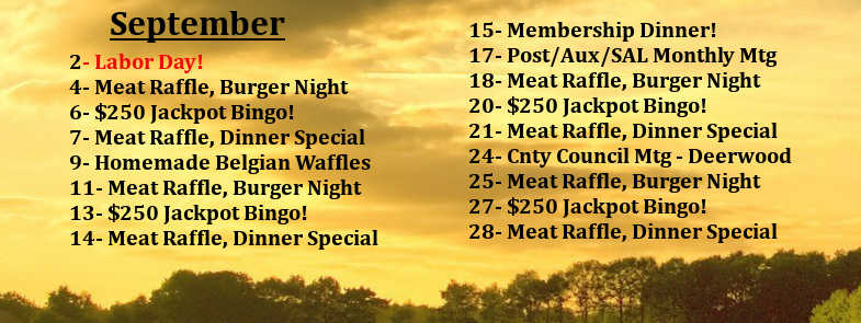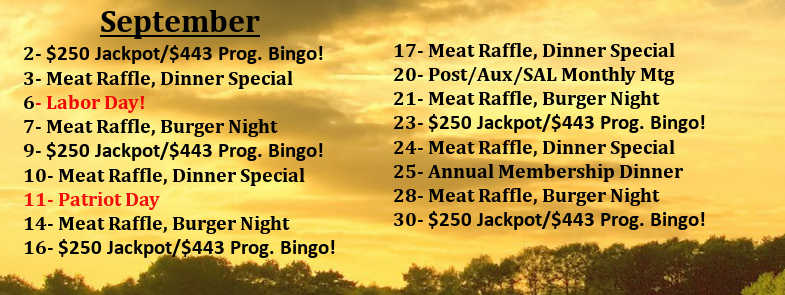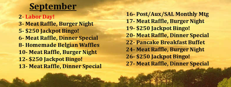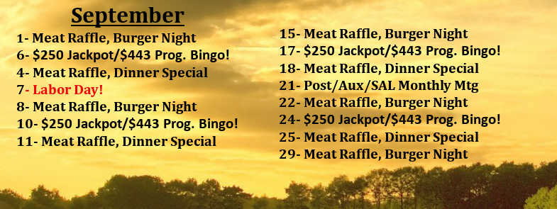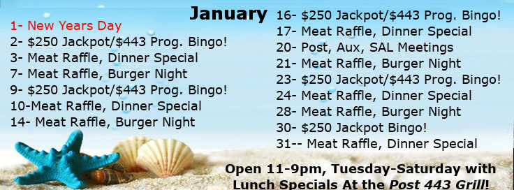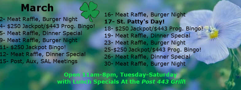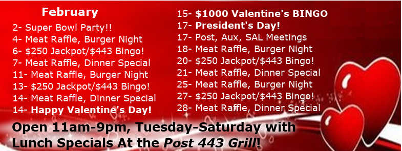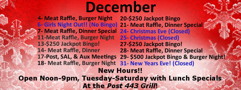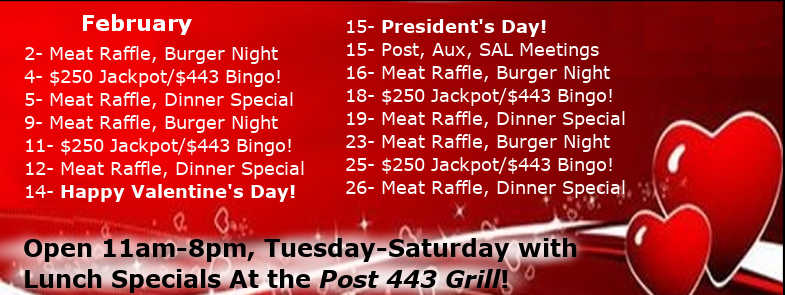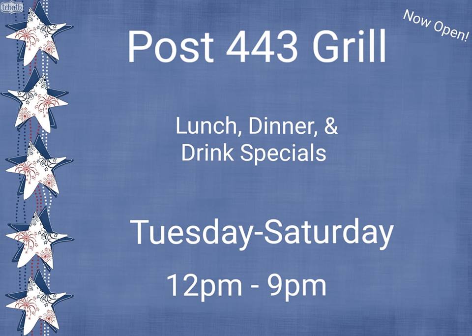 Tuesday- Saturday: Post 443 Grill (Bar and Kitchen) Open 12:00pm til 9pm!