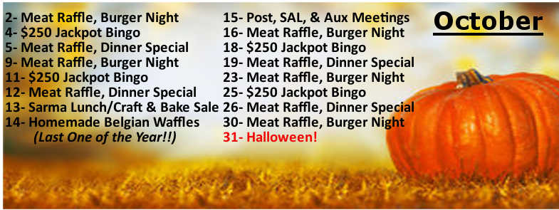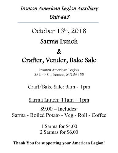 The Bake Sale, along with the Sarma Luncheon and Vendor/Craft Sale, will be held at the Ironton Legion on Saturday, October 15th.