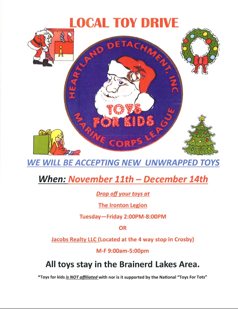 The Ironton American Legion, with Jacobs Realty, LLC in Crosby, are collecting New, Unwrapped toys for Toys for Kids.